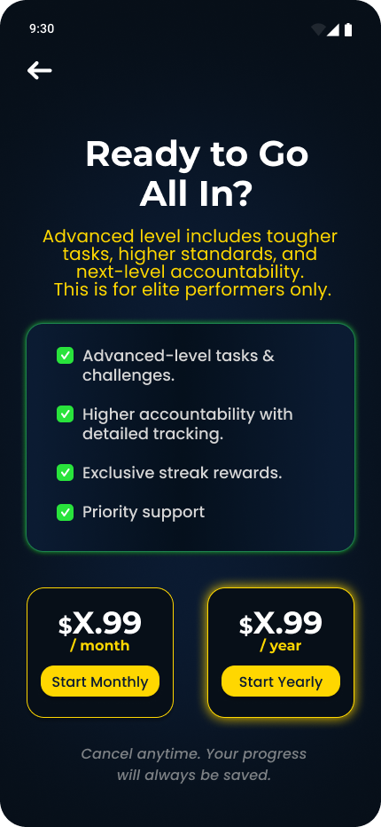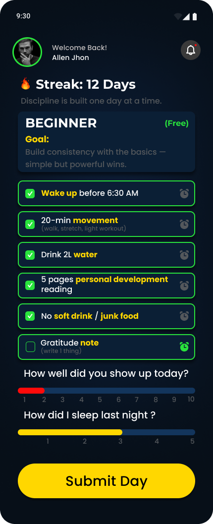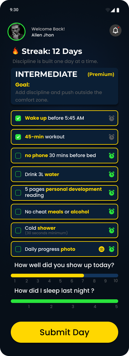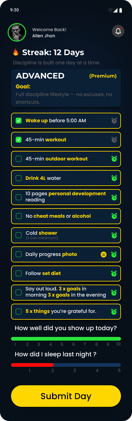 Push limits with full accountability and no excuses. Commit daily, track every win, and transform with unstoppable discipline.